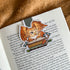 Magnetic bookmark with Gyra the Griffin and her stack of books.